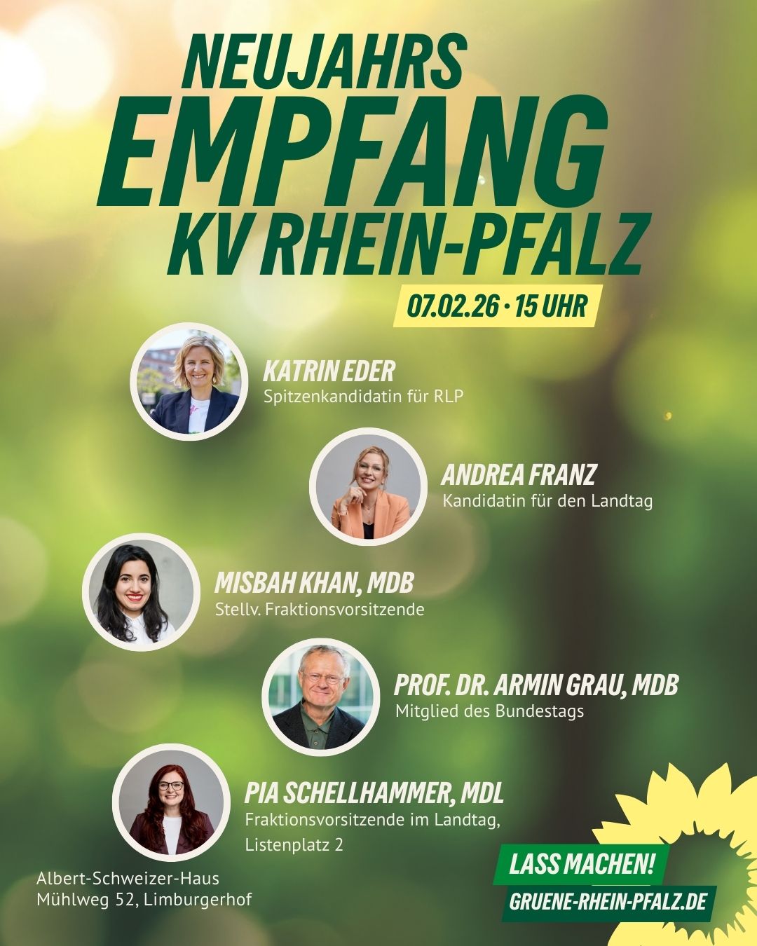 Zum Beginn des neuen Jahres möchten wir Sie / Euch herzlich zu unserem Neujahrsempfang einladen. Neben einem Glas Sekt gibt es weitere Getränke und etwas zum Essen in Form von „fingerfood“. In angenehmer Atmosphäre möchten wir gemeinsam auf das neue Jahr anstoßen, einen Rückblick wagen und einen Ausblick auf das Kommende geben. Mit Blick auf die kommenden Landtagswahlen in Rheinland-Pfalz am 22. März 2026 erwarten wir zahlreiche Gäste von der Landesebene. Ganz vorne mit dabei ist unsere Spitzenkandidatin Katrin Eder, die grüne Fraktionsvorsitzende im Landtag, Pia Schellhammer und unsere Direktkandidatin im WK Mutterstadt, Andrea Franz. Ihr Kommen zugesagt haben auch unsere beiden Bundestagsabgeordneten Misbah Khan und Armin Grau wie auch Jutta Paulus aus dem Europaparlament.